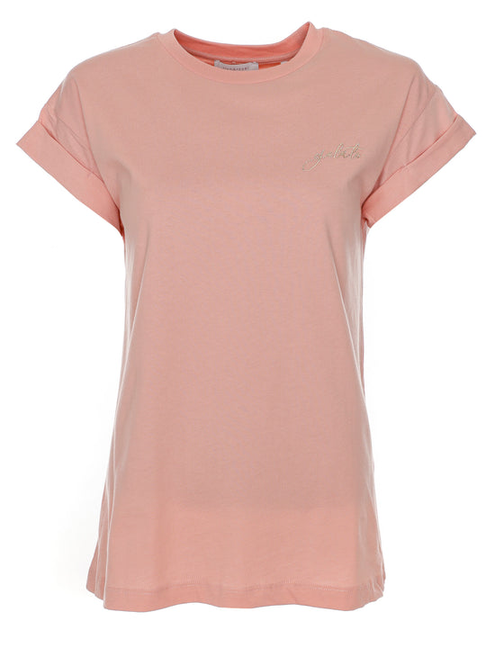 T-Shirt mit Rundhalsauschnitt,Rippbündchen am Ausschnitt,Hoch genähte Umschläge an den Ärmeln,Statement-Schriftzug mit Pailletten auf der Vorderseite,Normale Passform,Leicht verlängerte Rückenpartie,Leicht verkürzt,Länge: Hüftlang,Made in Portugal