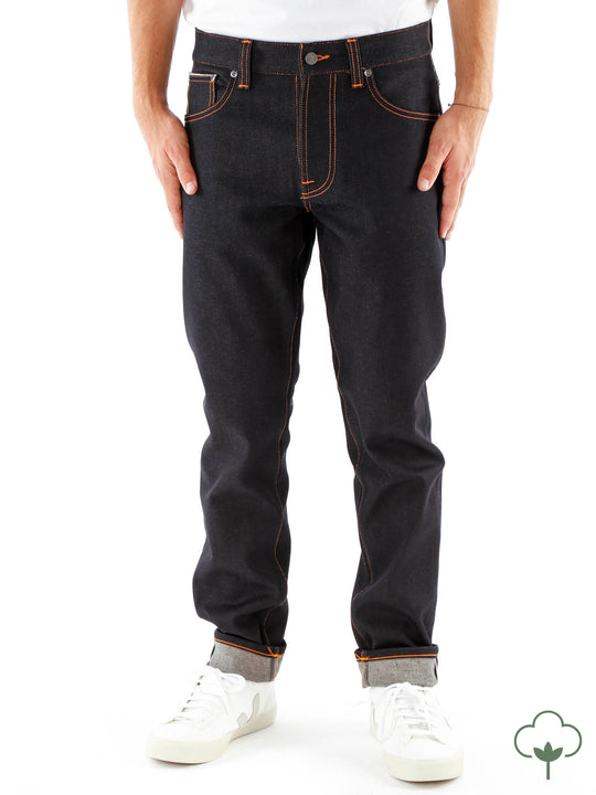 Slim Fit Jeans mit mittlerer Leibhöhe und schmal zulaufendem Beinverlauf,Dunkelblauer Raw-Denim Grundton,Waschung ergibt sich mit dem Eintragen der Jeans,Dry Selvadge Denim mit durchgehender Selvadge Naht,Kontrastierende klassiche orangene Nähte,Mit Reißverschluss und Knopf zu verschließen,Bei einer Größe von 1.87 m trägt unser Model Gr. 31/32