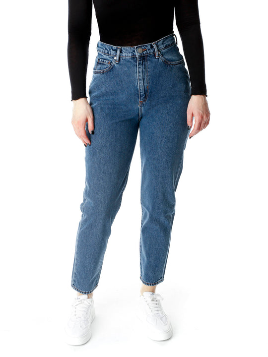 Mom Fit Jeans mit hoher Leibhöhe,5-Pocket Style,Leibhöhe: Sitzt oberhalb der Taille,Schmäler werdender Beinverlauf,Lockere Passform am Oberschenkel,Verkürzte Länge,Reißverschluss mit Knopf zum Verschließen,Logo-Patch auf der Rückseite