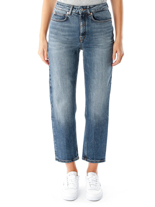 Mom Fit Jeans mit hoher Leibhöhe,Lässig weit am Oberschenkel mit schmal zulaufendem Beinverlauf,3D-Faltendetails am Oberschenkelansatz,Mit Knopf und Reißverschluss zu verschließen,Dunkelblauer Grundton mittelstark verwaschen,Verkürzte Beinlänge,Läsige Passform,Bei einer Größe von 1.75 m trägt unser Model Gr. 26/34