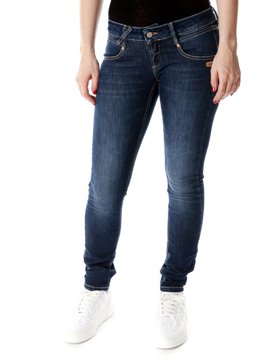 Skinny Fit Jeans mit mittlerer Leibhöhe,Schmaler Beinverlauf,Gekreuzte Gürtelschlaufen links vorn,Rundpasse mit leicht gerundete Gesäßtaschen formen einen runden Po,Dunkelblauer Grundton leicht ausgewaschen mit Fade-Effekten,Mit Reißverschluss und Knopf zu verschließen,Einheitslänge entspricht einer Länge zwischen L32 und L34,Bei einer Größe von 1.70 m trägt unser Model Gr. 26