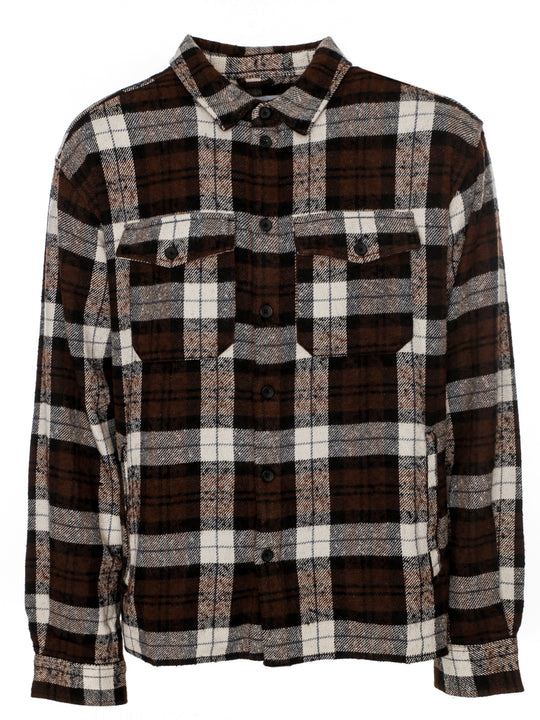 Grob gewebtes Overshirt mit Karomuster,Leicht aufgeraute Oberflächenstruktur,Durchgehende Knopfleiste vorn,Zwei aufgesetzte Pattentaschen mit Knopfverschluss,Zwei seitliche Eingrifftaschen,Ein-Knopf-Manschette,Ungefüttert,Weite lockere Passform,Länge: Hüftlang,Farbton: Braun-Schwarz