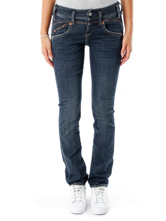 Slim Fit Jeans mit mittlerer Leibhöhe,Höherer Bund hinten um längere Beine und die Hüfte vorteilhaft zu formen,Dunkelblaue Waschung mit leichten Effekten,Tiefer gelegte vordere Eingrifftaschen,Mit einem Reißverschluss und Knopf zu verschließen,Keileinsätze über den Gesäßtaschen formen einen runden Po,Bei einer Größe von 1.75 m trägt unser Model Gr. 26/32