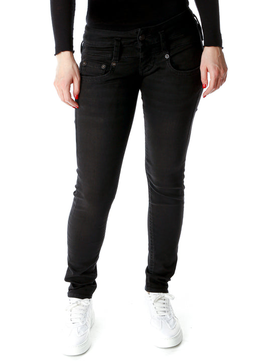 Schmale Slim Fit Jeans mit niedriger Leibhöhe und normaler Länge,Schwarzer einheitlicher Farbton,Tief sitzende vordere Eingrifftaschen,Push-up Effekt durch tief sitzende asymmetrische Gesäßtaschen,Dritte Gesäßtasche,Mit Knopf und Reißverschluss zu verschließen,Bei einer Größe von 1.70 m trägt unser Model Gr. 26/30