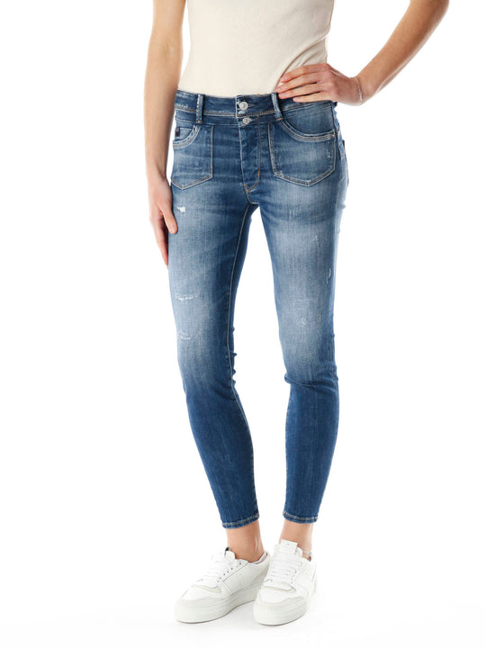 Slim Fit Jeans mit mittlerer Leibhöhe*Plumping-Effekt am Gesäß*Five-Pocket-Style*Mit verdeckter Knopfleiste zu verschließen*Destroyed-Effekte auf Vorder- sowie Rückseite*Dunkelblauer Grundton mit starken Fade-Effekten*Abriebstellen an den Taschen- und Abschlusskanten*Verkürzte Einheitslänge*Bei einer Größe von 1.73 m trägt unser Model die Gr. 26