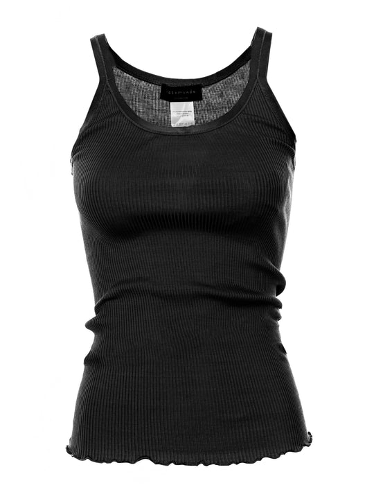 Nahtloses Ripp-TankTop*Elastische figurnahe Passform*Tiefer Rundhalsausschnitt*An Ausschnitt und Trägern glänzendes Lurexband als alstische Einfassung*Unterer Saumabschluss gerüscht*Länge: Hüftlang