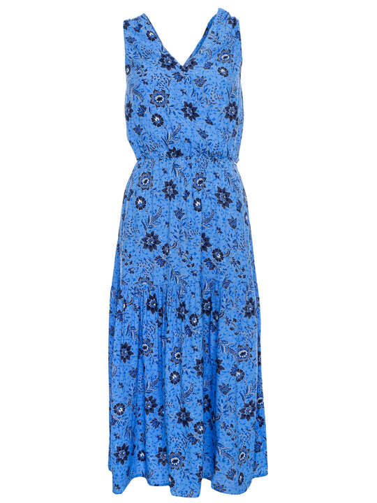 • Fließendes Midi-Kleid mit tiefem V-Ausschnitt,All-over Print aus Blumen,Grundton in hellblau mit dunkelblauen Details,Überkreuzte Riemen an der Rückseite,Ärmellos,Schmale Oberkörperpartie mit weit zulaufender Beinpartie,Einsatz mit Innenkleid,Lockere Passform,Wellen am Saum,Länge: Wadenlang