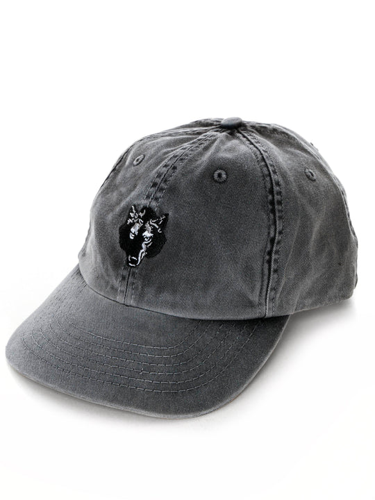 6-Panel Low Profile Cap in Vintage Grey Waschung,Gesticktes Motiv auf der Vorderseite,Justierbarer Lederverschluss auf der Rückseite